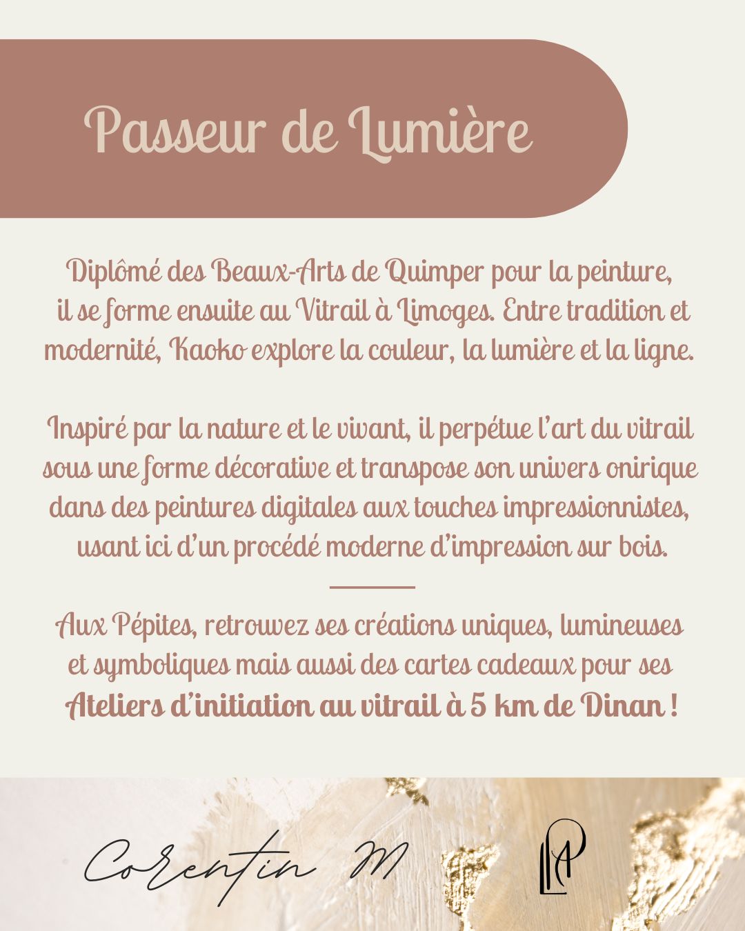 Après avoir décroché un Bac littéraire option arts-plastiques à Saint-Malo, j'ai poursuivi mes études en passant ma licence (DNAP) à l'école des Beaux-Arts de Quimper. Durant cette formation, j'ai réalisé que mon travail du pastel s'orientait naturellement vers des techniques de vitrailliste ; raison pour laquelle j'ai décidé de me former à cette pratique au travers d'un CAP vitrailliste art et technique du verre à Limoges. J'ai décidé de revenir à mes sources, la Bretagne, pour exercer mon métier qui n'en est pas moins une passion.